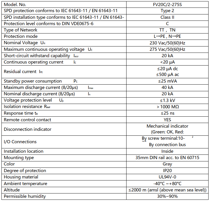 1. High discharge current. FV20C series is Imax 40kA 8/20us