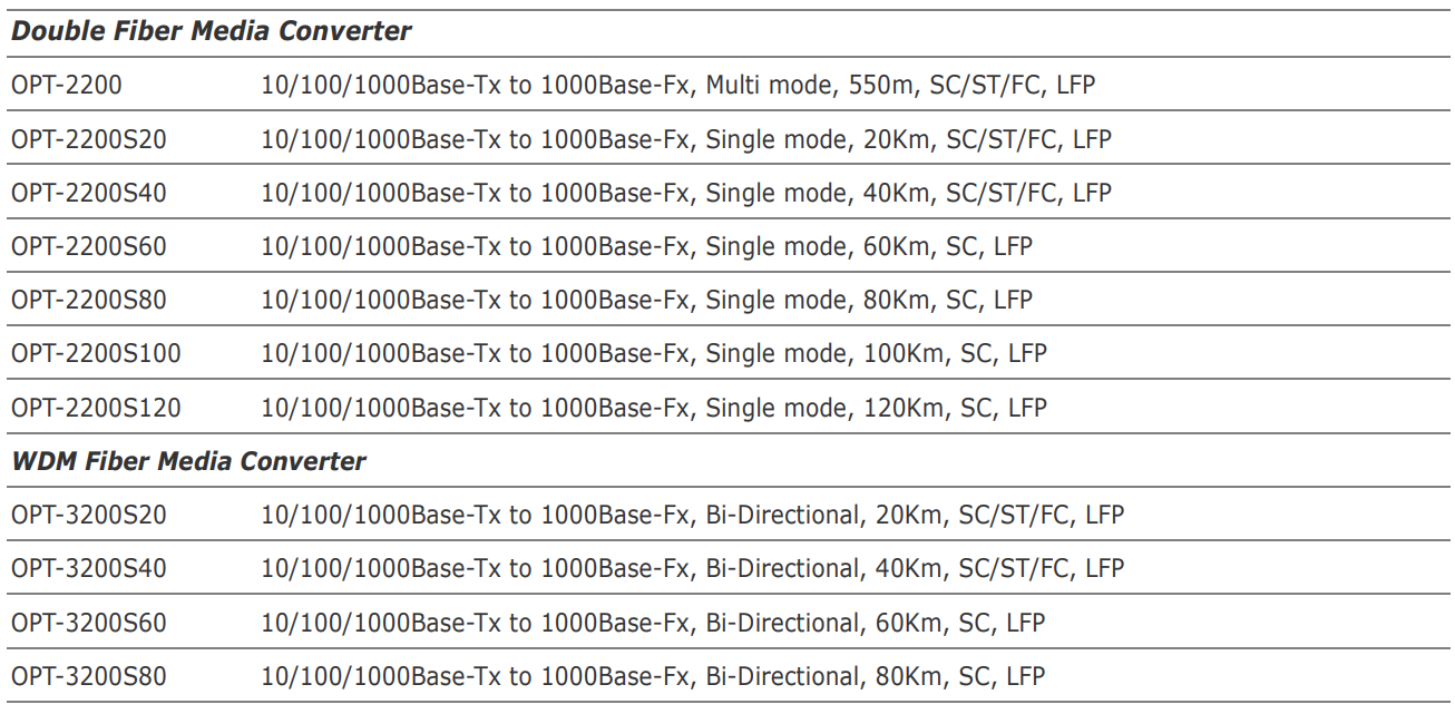 Dòng OPT-2200S20 tuân thủ chuẩn IEEE 802.3 / ab Gigabit Ethernet. Nó hỗ trợ hai loại phương tiện để kết nối mạng như 10/100/1000 Base-Tto 1000 Base SX / LX và kết nối các kiểu phân đoạn này để vận hành trơn tru OPT-2200S20 series có thể được sử dụng trong 16 khe cắm như cắm module OPT-2200series Fiber Media Converter chuyển đổi phương tiện 1000Base-T (Đồng Gigabit) sang phương tiện truyền thông 1000Base-SX / LX (Fiber Gigabit) và ngược lại. Cổng 1000Base-T hỗ trợ kết nối Gigabit full-duplex ở tốc độ dây với đầu nối RJ45. Kết nối Gigabit hỗ trợ sóng ngắn (SX) hoặc sóng laze dài (LX) với đầu nối loại SC đa mode hoặc đơn mode.Bộ chuyển đổi này sẽ cung cấp cho bạn kết nối Gigabit của bạn với khả năng kết nối với kết nối cáp qua khả năng tuân thủ lên tới 80 km! 10/100 / 1000means, bộ chuyển đổi phương tiện chuyển đổi tín hiệu điện của tín hiệu Ethernet a10 / 100/1000 từ đồng sang sợi quang. Giải pháp này sẽ cung cấp tùy chọn tích hợp chi phí cho các nhà quản lý mạng, những người muốn di chuyển từ 10/100 mạng sang Gigabit Ethernet. Giờ đây, các switch Gigabit chỉ có thể được kết nối với 10/100 mạng mà không cần nâng cấp phía 10/100, cho phép các nhà quản lý mạng thêm thiết bị mới dần dầnNhững đặc điểm chính+ Tuân thủ IEEE 802.3, IEEE 802.3u, IEEE802.3z , IEEE802.3ab, đàm phán IEEE 802.3xauto