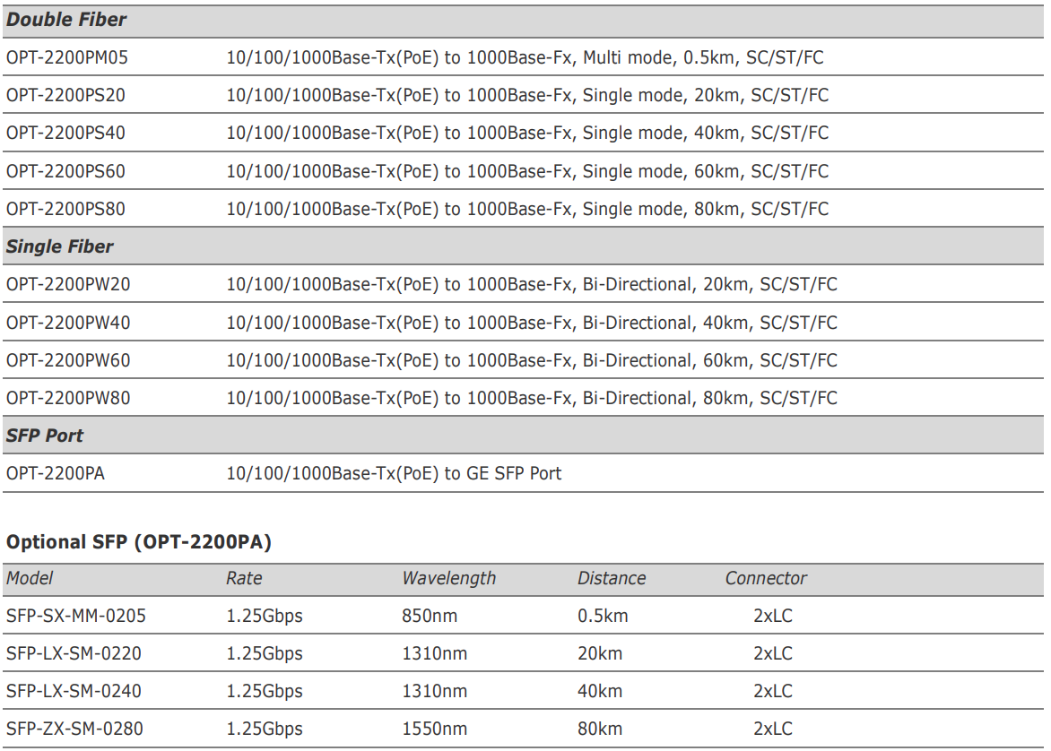 | Optical Port | Available for 1310nm and 1550nm Single mode, and 850nm Multi mode Transfer Distance: up to 120km Connectors: SC, ST, FC and SFP optional Fiber core: 8.3μm, 8.7μm, 9μm and 10μm on single-mode fiber; 50, 62.5 and 100μm on multi-mode fiber |