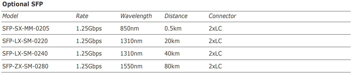 to use different SFP modules, such as 1000BaseT, 1000Base-SX, 1000Base-LX and so on. Switch