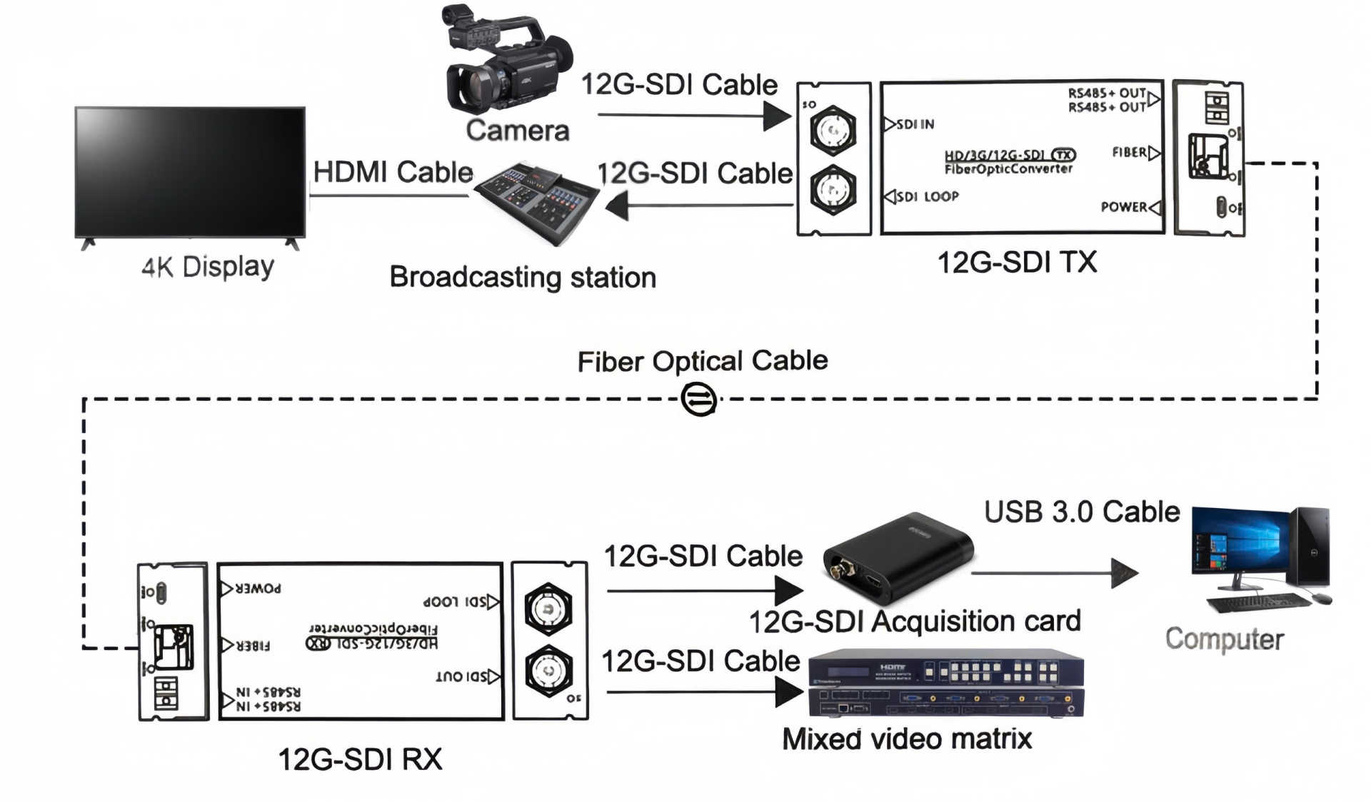 UPCOM Mini 12G-SDI UHD video to fiber optical converter is widely used in broadcast applications for the transport of uncompressed digital video streams up to 4K resolutions over coax cable.it can transmit one channel forward 12G-SDI video and one channel reverse RS485 Data / Tally signal (optional) through a single fiber optic cable,realizing no delay,no compression,high-quality signal extension of 20km with LED status indication on the body of device. The working status of devices can be visually observed. Besides, the switch value, voltage, working status and other reverse useful signal information can be controlled by RS485 or RS232.This ensures our devices more flexible when meet different customer requirements.