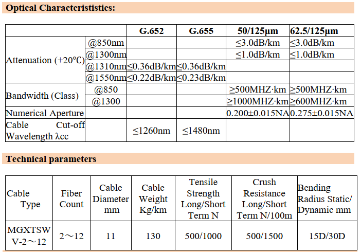 MGXTSWV fiber optic cable, the fibers,200μm or 250μm, are positioned in a loose tube made of a high modulus plastic. The tubes are filled with a water-resistant filling compound. The tube is wrapped with a layer of PSP longitudinally. Between the PSP and the loose tube water-blocking material is applied to keep the cable compact and watertight. Two parallel steel wires are placed at the two sides of the steel tape, over a thin inner PE sheath, the cable is completed with a polyethylene (PE) outer sheath.