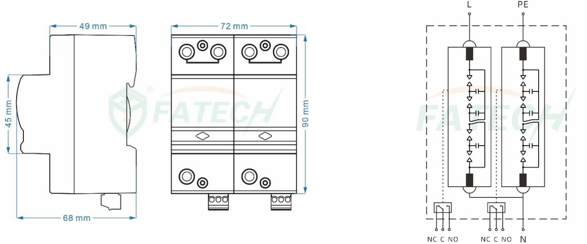 Kích thước của thiết bị chống sét lan truyền FV25B/1+NPE-255S