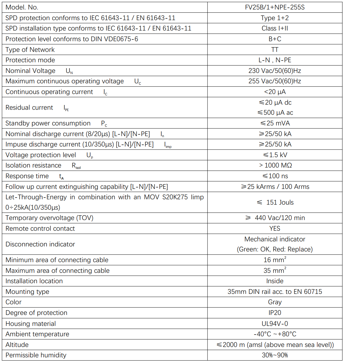 Thông số điện tử của thiết bị chống sét FV25B/1+NPE-255 S