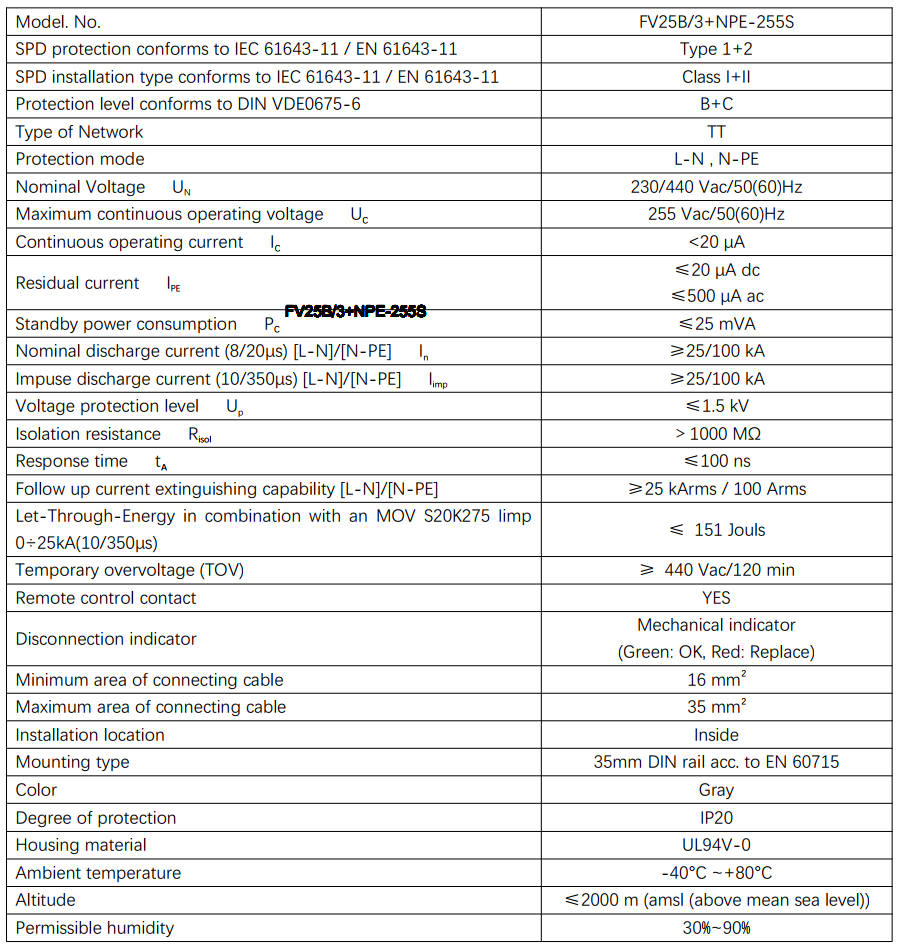 Thông số điện tử của thiết bị chống sét FV25B/3+NPE-255 S