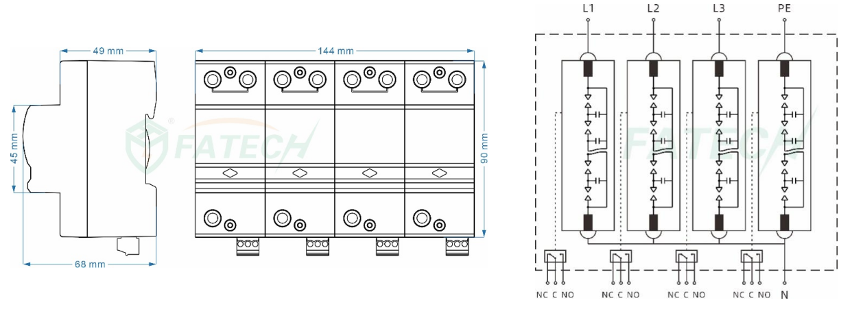 Kích thước của thiết bị chống sét lan truyền FV25B/3+NPE-255S